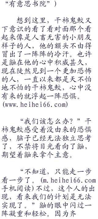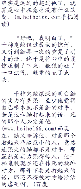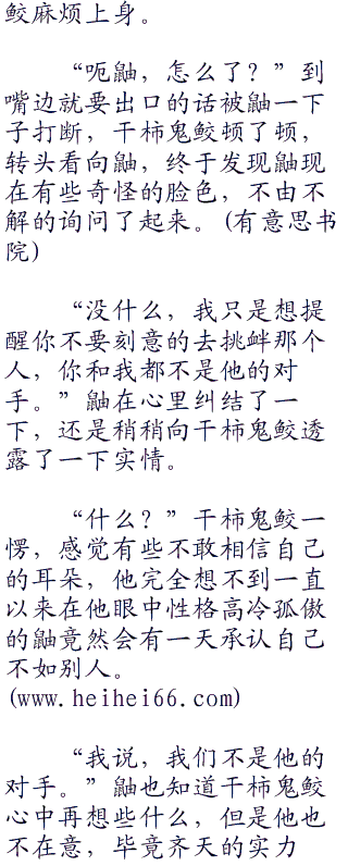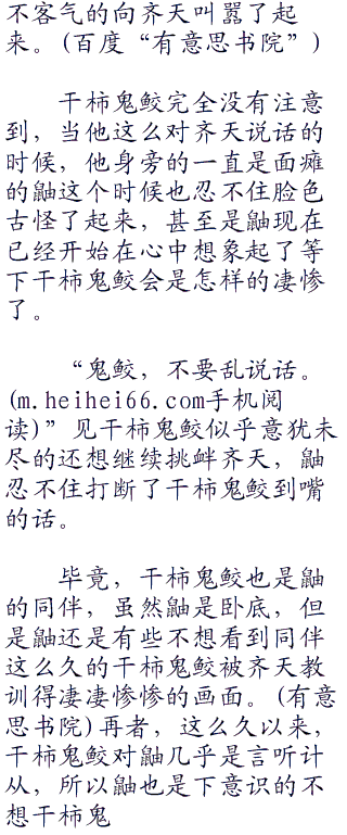 “小鬼,鲨鱼脸也是你叫的吗?”干柿鬼鲛努力的控制自己心中的怒火,见说话的齐天身高不高,整个人看起来也就十一二岁的样子,便咧着残忍的嘴角,毫