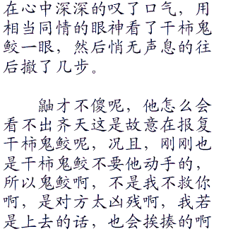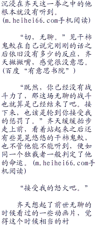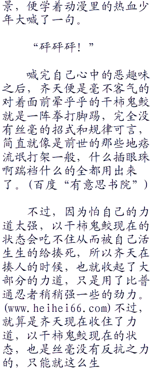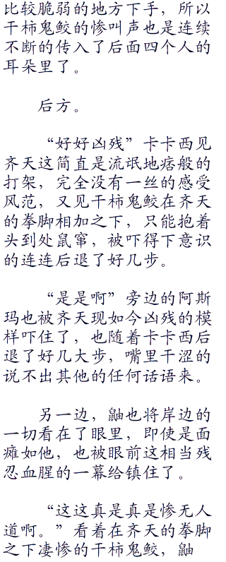 “真是个可怜的人啊。”卡卡西看着再次倒飞了出去的被齐天虐得凄凄惨惨的干柿鬼鲛,都有些为这个家伙感到同情了。