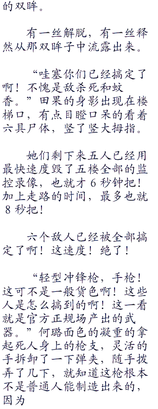 看到整个过程的监控前的小队长,满脸的凝重,这些女人的身手,他们还是低估了,那些还有那丝毫不留情的手段,和他们身处于战争中的雇佣兵不相上下啊!