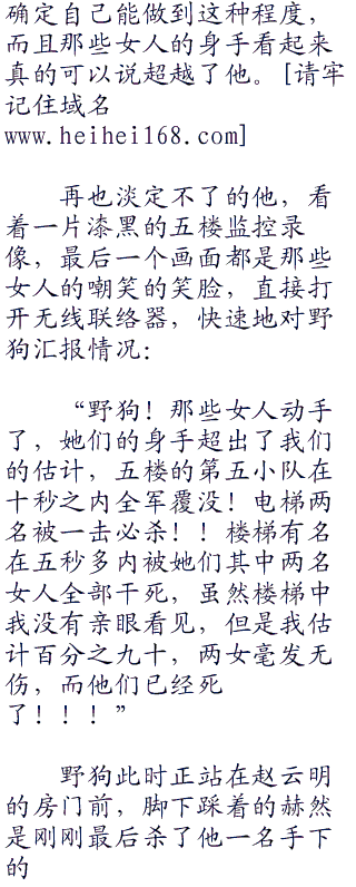 监控室则是一片寂静,众人都能听见自己那紧张的心跳声,对讲机那边的惨叫已经表明楼梯口那边的几人已经死亡,因为任凭自己手下呼叫,已经没有了一丝动静。