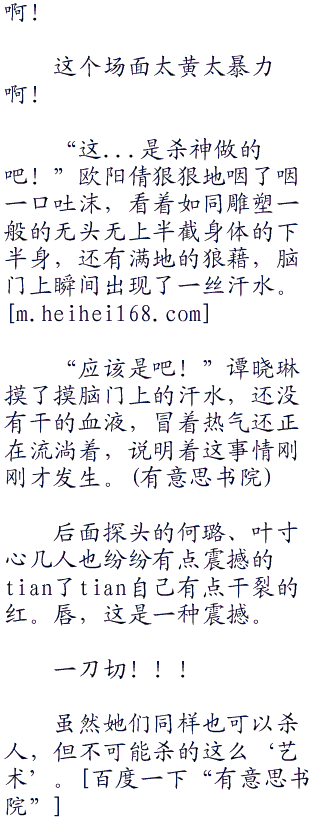 可以从站立的两个无头无肩膀的尸体看出,肉。体的切口非常光滑,也就是根本没有一丝反抗的余地,就好像切豆腐一般,轻轻松松。