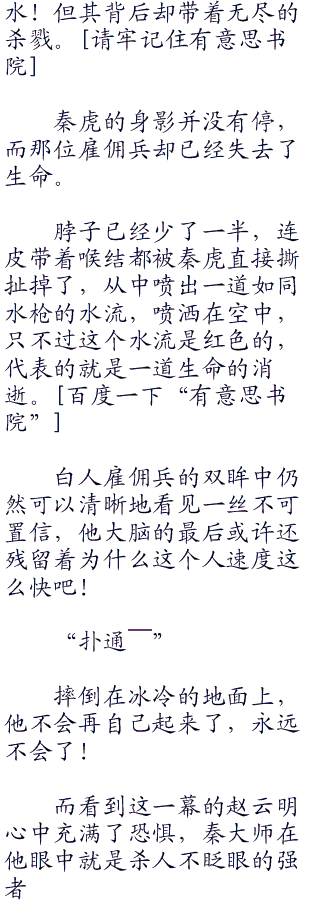 窜入二楼的时候迎面就遇到了一个雇佣兵,那个雇佣兵是个白人,也被秦虎给惊得连连后退,尤其是看到秦虎手力还提着一个人的时候,这得多大的臂力啊!