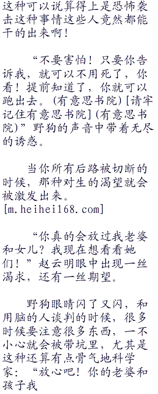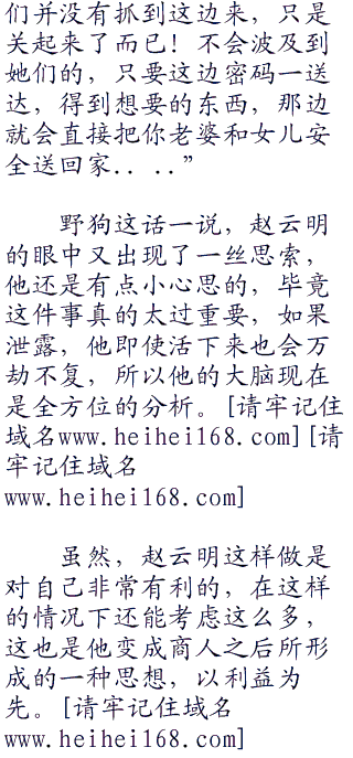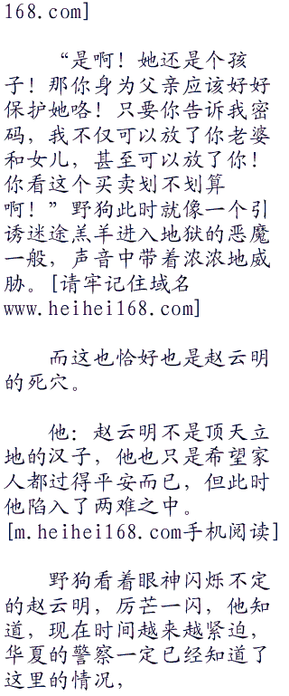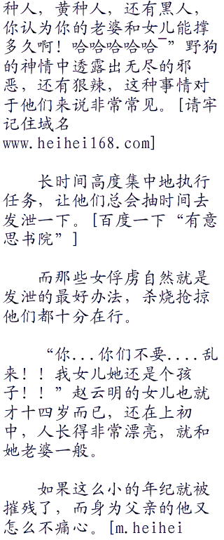 “呵呵~~赵先生,你的女儿长得可真漂亮,老婆也不错!我的那些弟兄可是好久都没开荤了,要知道我的弟兄可来自世界各地,有白