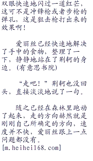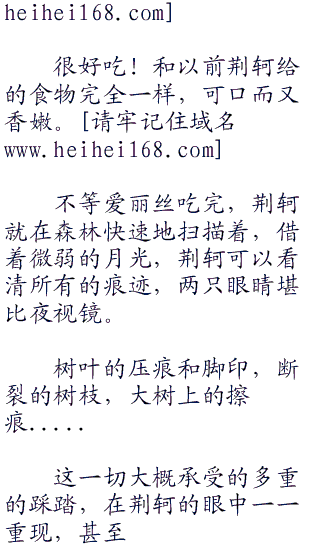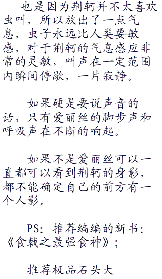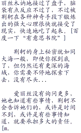 “快吃吧!我们今晚估计得连夜追踪。”荆轲好像没看见爱丽丝那惊讶的表情一般,淡淡地把盘子递给了爱丽丝。