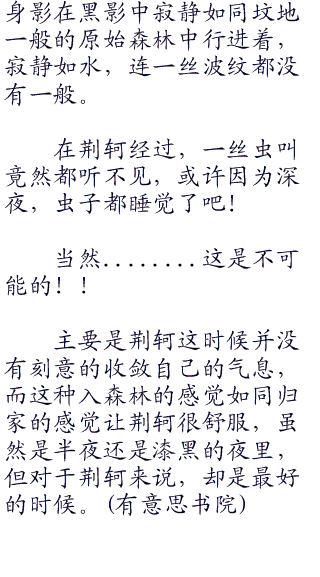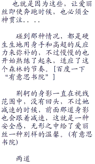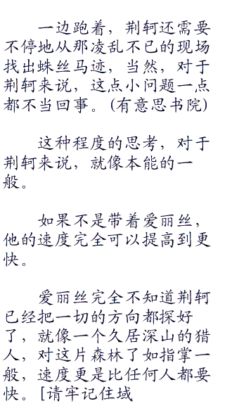 爱丽丝和荆轲训练的时候,在树林中单独相处过,但大多数荆轲都是神出鬼没的,而且两人的实力相差太大,即使荆轲迁就她,也完全跟不上,所以训练的时候,大多数还是一个人训练。