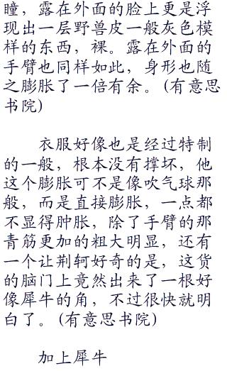 而且当看到这个强壮如同野兽的犀牛,用着这么熟悉的招式躲过去了时,荆轲脑门上也不由得垂落下几丝黑线!