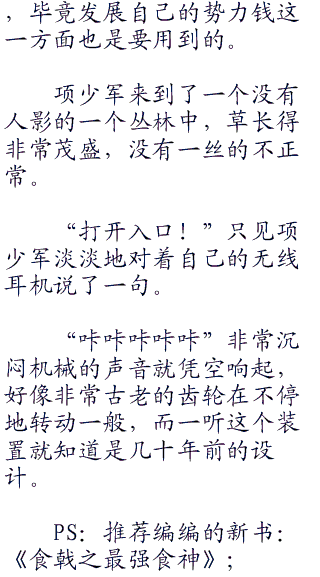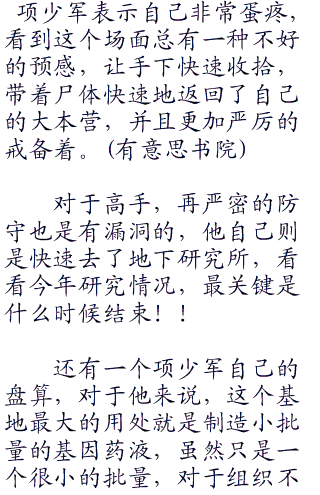 所以项少军直接把自己的战斗人员都驻扎在地面上,也是为了地下研究的稳定进行吧!