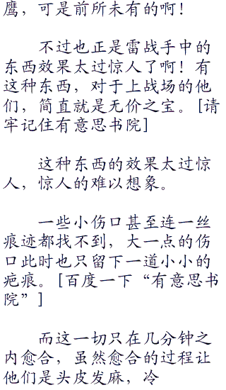 几分钟过后,张大炮和左鹰目瞪口呆的看着身上的已经愈合的伤口,虽然被削去的手指不能长出来,但是这种效果真尼玛太惊人了