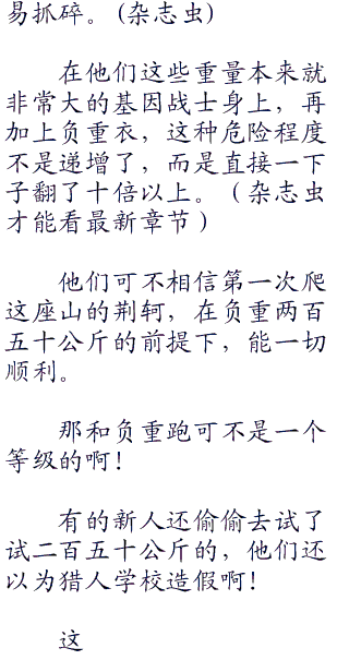 他们中间最强的负重也才两百公斤,也就一个!但也不敢穿着两百公斤去爬山啊!太危险了啊!以前有人试了,直接摔成了重伤,那还是因为没爬多高的原因,就算是这样,也是因为他们适应了一年的结果,训练时候,每周的必修课。