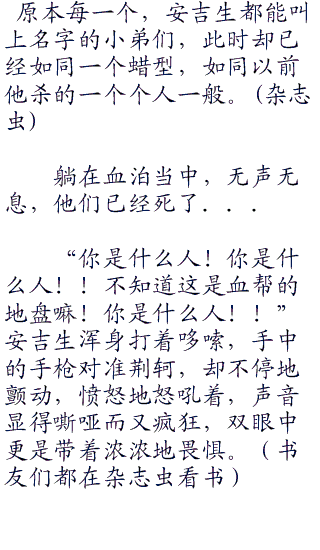 而刚刚和安吉生通话的那个帮众,此时已经两眼圆瞪地趴在地上,满地的血液,手中还死死地握着对讲机,已经没有了声息。