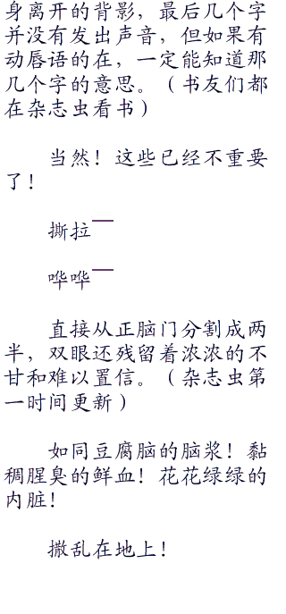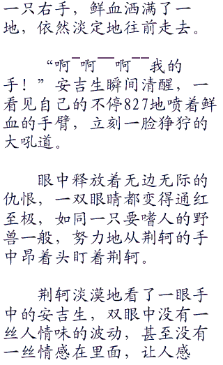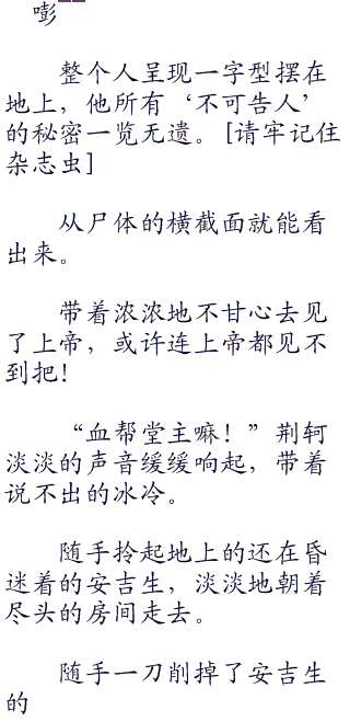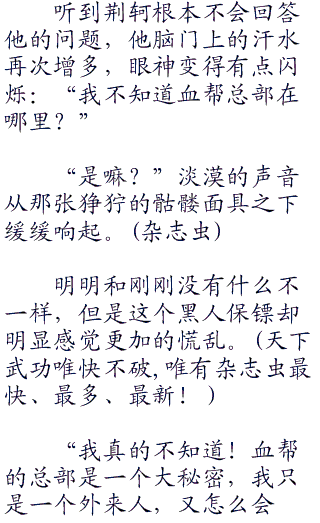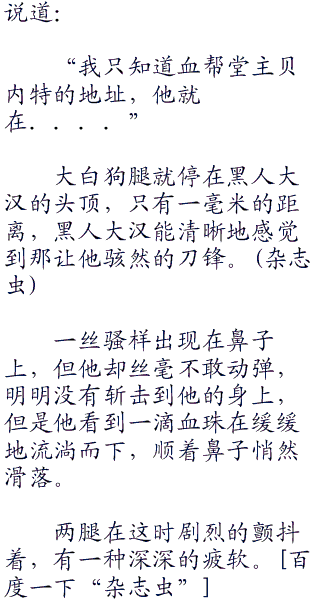 “血....血....帮...总部!!!你...知道..这..是...血帮....的地盘?”声音显得有点结结巴巴16,语无伦次。