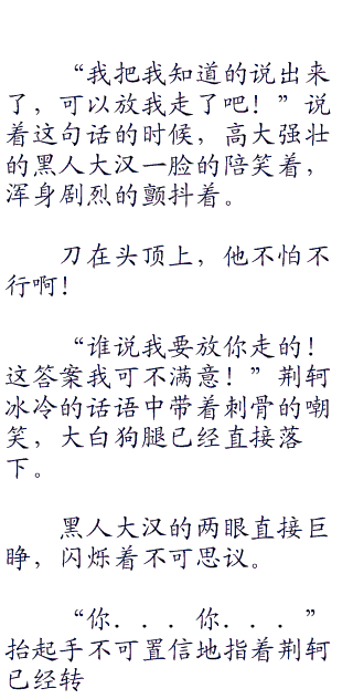 让黑人大汉的声音戛然而止,两眼不可置信地看着荆轲,好像听到了不得了的事情。