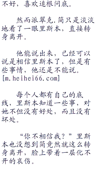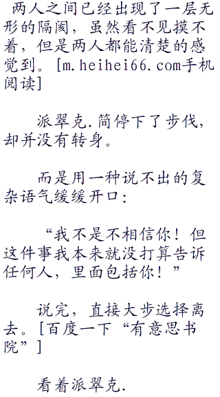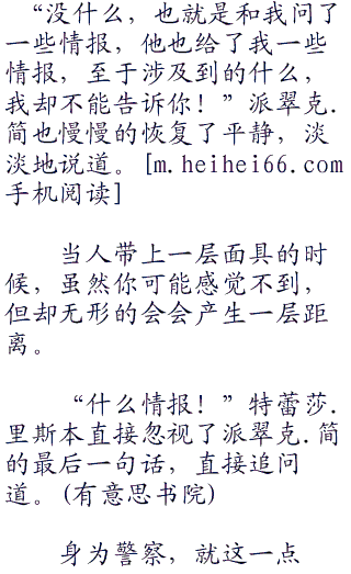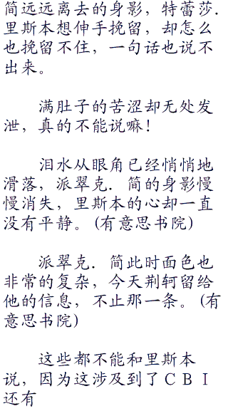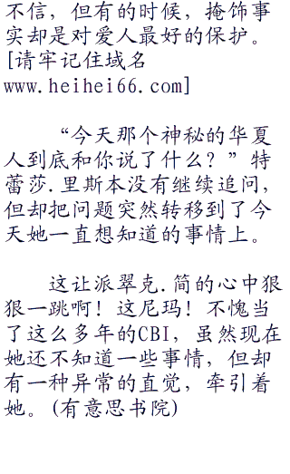 “你很不对劲,到底怎么回事?”特蕾莎.里斯本有点不安地抓“零三零”住派翠克.简的手臂,直接凑上前盯着他那双迷人的双眼,想看清他心中到底想的是什么。