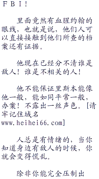 “我只是进去了一下,根本没看清什么,就出来了!这种案件还是交给fbi把!已经属于国际问题了!不是我们管辖的范围了!”派翠克.简第一次竟然选择了不管案件,这是里斯本从来没遇见过的。