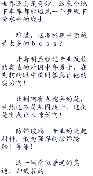 一辆黑色流线型的奥迪从远处急速行驶而来,一个漂亮的甩尾出现在荆轲的身前不远处,正好停在一个方框之内。