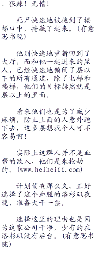 “好!”那个黑人也摆了摆头,感觉自己太敏感了,直接朝着死尸后面的管理室走去,他们早就弄到了这座大厦的设计图,那里就有控制着整幢大楼的电门开关。