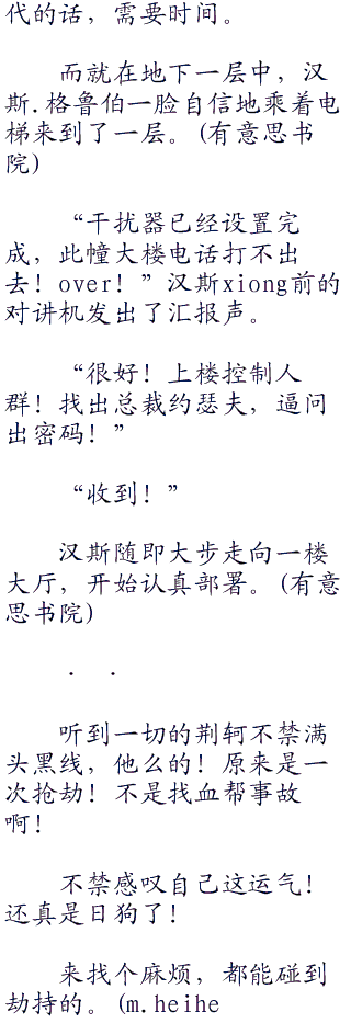 而正大厅那位开枪的那位金发外国人,朝着里面的电梯走去,他们知道这边有两个值班的安保人员。