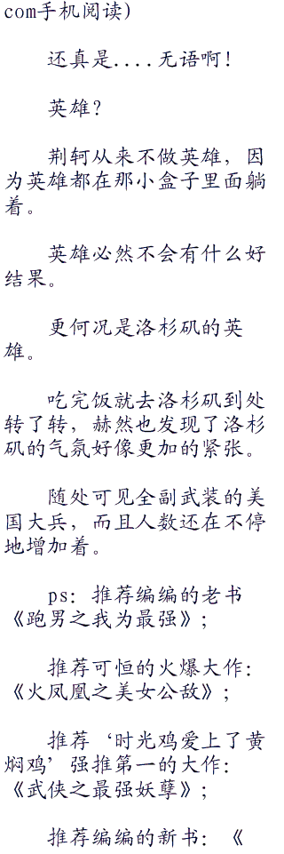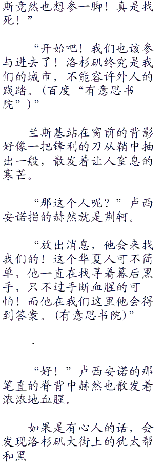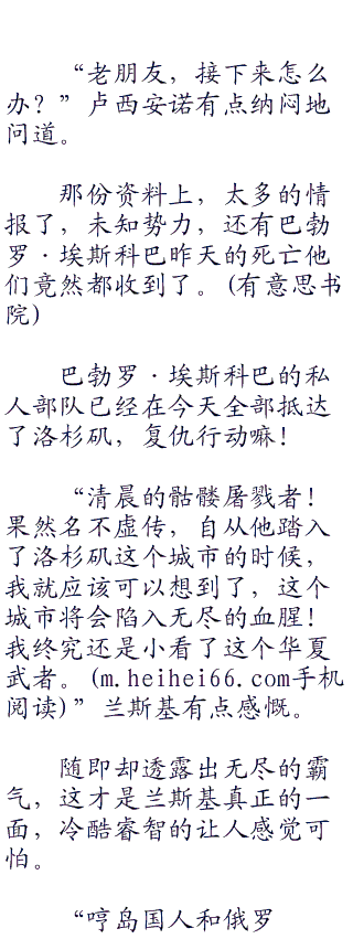 兰斯基拍了拍脑门,起身走到了窗前,看着屋外的洛杉矶明明很灿烂的阳光,但是他却从里面看到了浓浓地血腥之气。