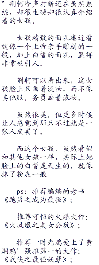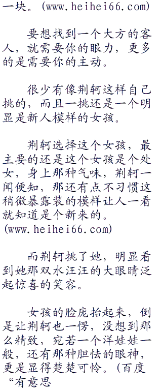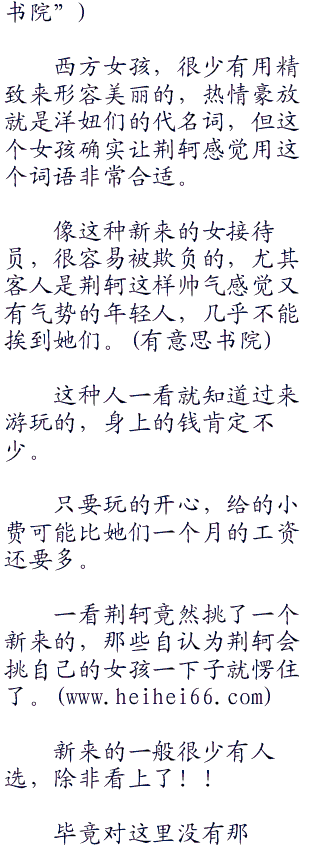 然而荆轲却直接挑了一位站在角落中略显青涩的女孩,有点渴望却又害怕地呆在角落中,忽视了直接迎接上来的几个女接待员。