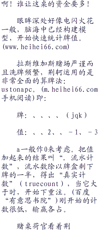 荆轲无视了其它热热闹闹的牌桌、激斗正酣的百-家乐,只玩点。因为它是赌博游戏中,唯一能够在相当长的时间里,运用技巧赢钱的游戏。