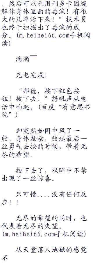“从急救箱中拿出震颤器,将探头贴在你的xiong口,等它充电完成,在你心跳的那一刹那按下红色按钮,如果幸运的话,达到急救的功能,让心脏再次恢复跳动,然后可以去医院进行排毒。”