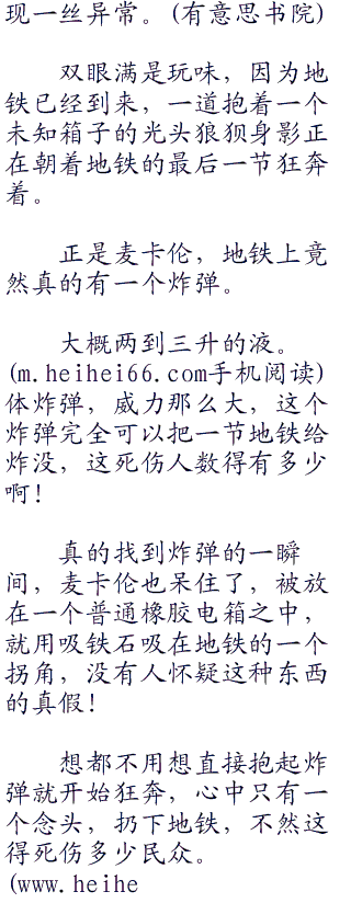 “脚抬起来!抬起“五九零”来!我是警察!警察!”麦克伦快速地在地铁车厢中快速穿行着,双眼如电。