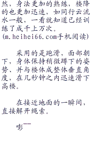 运用的赫然是速降中的坐滑,上身保持正直,双。腿伸直或微曲蹬在楼壁上,熟练至极。