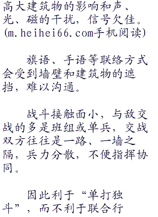 城市作战是现代战争的主要形式之一,城市街巷纵横,建筑物高大、坚固、密集,地下工程设施复杂,作战条件恶劣。