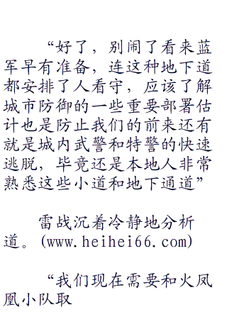 而此时,雷电突击队已经从地下道不知不觉的入侵了城市之中,带着夜视镜,快速地前进着。