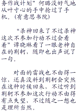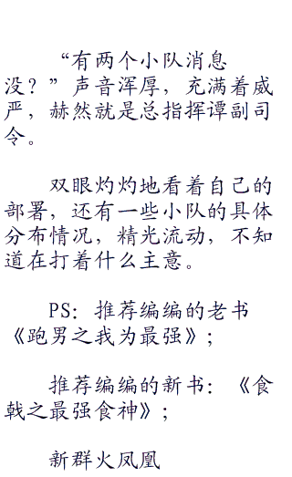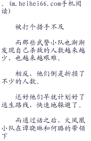 谁都知道叶寸心的手机号,毕竟她是一个网虫,而且黑客技术还很厉害,肯定会带着通讯设备,这也就方便了即使雷电突击队和火凤凰小队没有碰面,也能在没有碰面的时候最快的时间中取得联系。)