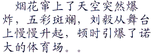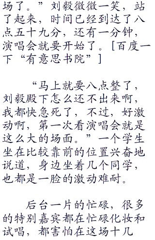 “哎呀,怎么还不到八点啊,我要看刘毅,我要听他唱歌。”人们寻找着自己的位置,找到了位置的做好后期待着刘毅的演唱会快些开始。