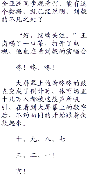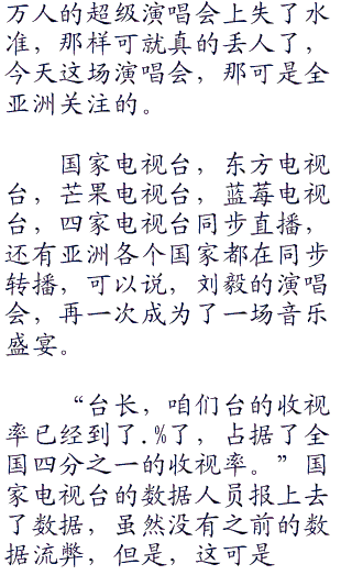 “哎呀,人好多啊,整个体育场都挤满了人,这少说有十万人了吧!喜欢刘毅殿下的人真多。”一个歌迷看着这人山人海,心中惊叹道,更多的是欢喜,自己的偶像被这么多人喜爱,这说明自己喜欢的偶像受欢迎,自己也没有喜欢错这个偶像。