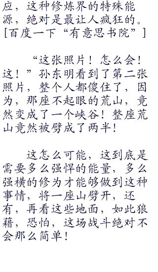 张照片中,一座荒山并没有什么初期的地方,但是孙东明知道,这座不起眼的荒山下边,上千米的地方有着大量的能源反