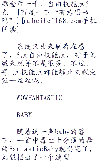 “接下来,送给大家一首我最新创作出来的歌曲,名字叫做FantasticBaby,大家一定会,喜欢的。”换好了一身个性十足的服装后,刘毅做了一个稍稍潮流的发型,显得十分妖孽。