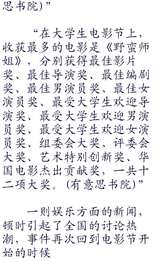 “好,下面我们来关注一下文化方面,昨天,京城大学生电影节闭幕式及颁奖典礼在国家体育馆举行,包括刘毅,千颂伊,斯琴高娃,秦浩,李雪健,顾长威,梁靖,陶红,管湖,徐征等两百余位电影人参加了这个一年一度的青春电影盛宴。”