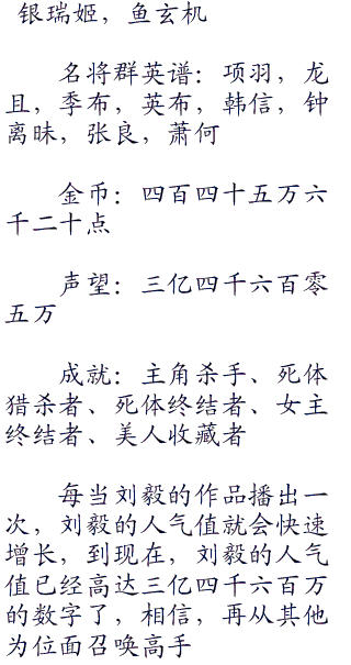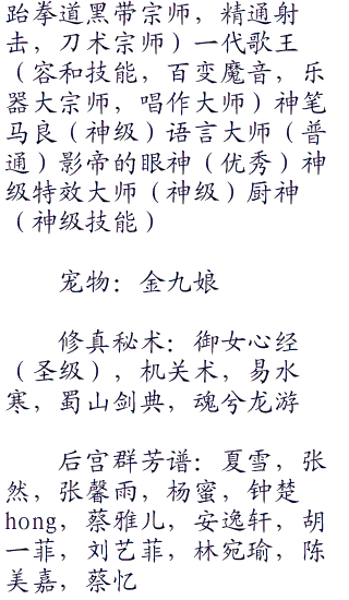 技能:高级演技(普通)小说宗师(优秀)魅力释放(高等)枪斗术(容和技能,拳术宗师,
