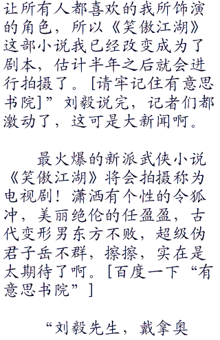 “刘毅先生,我是九州杂志的编辑小莫,我想请问一下您,您的新书《笑傲江湖》现在非常的火爆,可以说全国读者都在看,您有没有打算将他拍摄称为电视剧?”