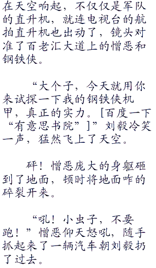 天空中的直升机中,罗斯将军和布鲁克斯以及贝蒂都在,本来班纳都想着跳直升飞机变身浩克来制服憎恶了,结果没想到,就在这时,钢铁侠突然出现。