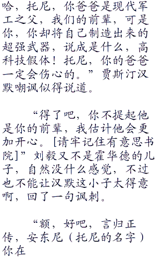 “我再说一遍,我拒绝交出钢铁侠战衣,我决绝交出任何与钢铁侠战衣有关的技术,这是我个人私有的东西,部长先生,如果你认为美国政府能够强迫一位公“零一零”民将自己的财务上交给国家依旧代表着民主自由的话,我认为,美国将会毁在你的手里。”