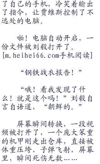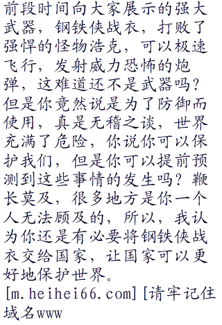 当刘毅在新闻发布会上穿着钢铁侠战衣宣布自己就是钢铁侠的时候,整个世界都在为他疯狂,只因为,在当今世界,钢铁侠战衣就相当于核武器,哪个国家拥有这个,就相当于拥有了无上武力,称霸世界,还远吗?