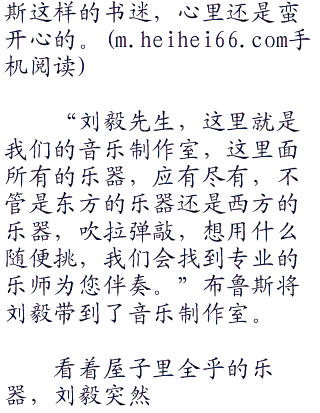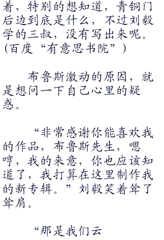 “哈哈,刘毅先生玩笑了,我是您的书迷,自从看了盗墓笔记之后,惊为天人,没想到华国还有这么多神“四一零”奇的地方,当然,我知道这是您想象出来的,而这些故事又让我为之魂牵梦绕,后来我就把这家录音棚改名改成了云顶天宫。”布鲁斯显得很兴奋,见到了自己的偶像,能不兴奋吗?