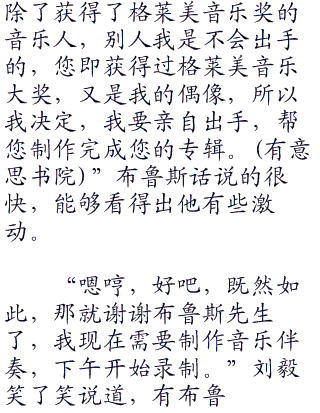 这里是美国最高级的录音棚,来这里录音的音乐人都是音乐圈里数一数二的大佬,在格莱美大奖上面拿过奖的人更是数不胜数,但是让布鲁斯最激动的,还是见到刘毅之后。