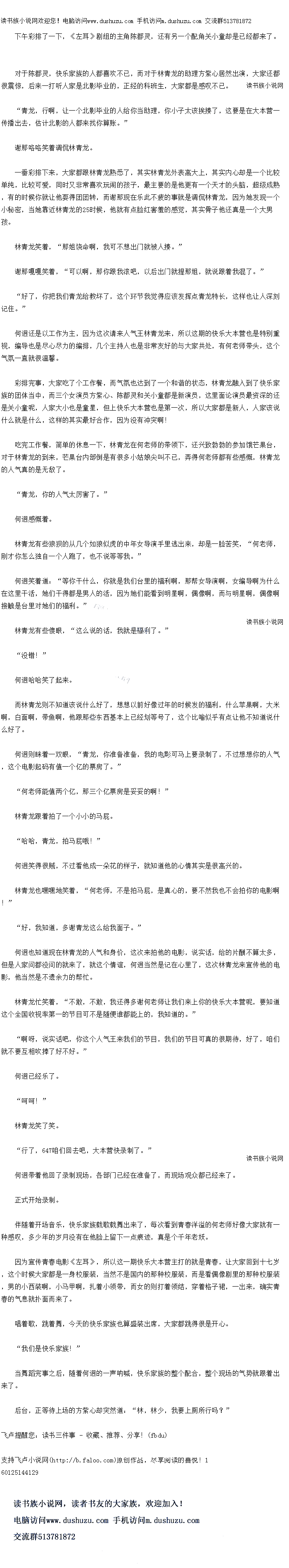 吃完工作餐,简单的休息一下,林青龙在何老师的带领下,还兴致勃勃的参加饿芒果台,对于林青龙的到来,芒果台内部倒是有很多小姑娘尖叫不已,弄得何老师都有些感慨,困青龙