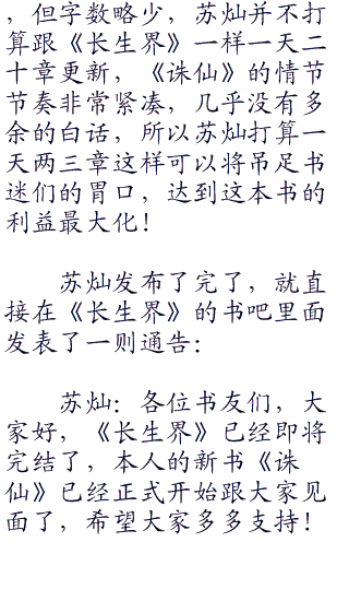 “还有,你的那本《诛仙》也改发布了,《长生界》已经快完结了,最迟这几天,《长生界》就更新完本了。”林宛瑜说道。