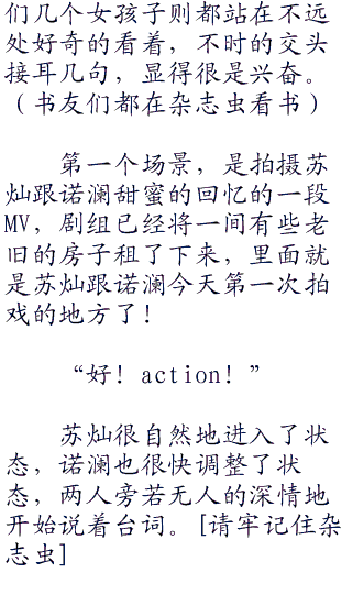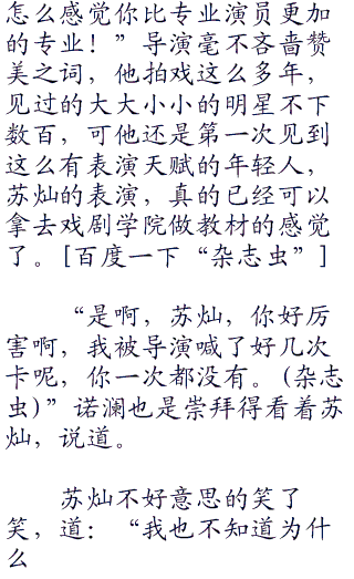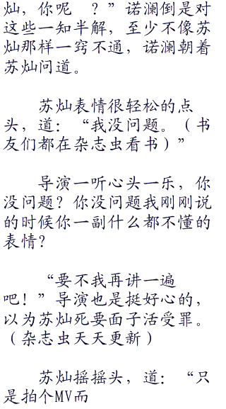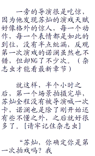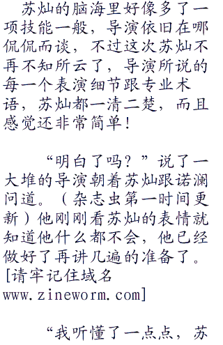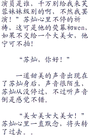 导演跟苏灿和诺澜耐心的讲解着戏,诺澜是听得频频点头,但苏灿听得是一阵头疼,他从来都不知道什么叫拍戏,导演跟他讲了一堆专业术语,什么站位,什么镜头角度,什么情感流露等等这些苏灿听都没听过的东西,搞得苏灿一阵头疼。