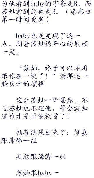 苏灿等人也是都点头,看大家都同意,何炯也只好宣布开始下一轮,抽签重新开始,不过这次,苏灿如愿了!
