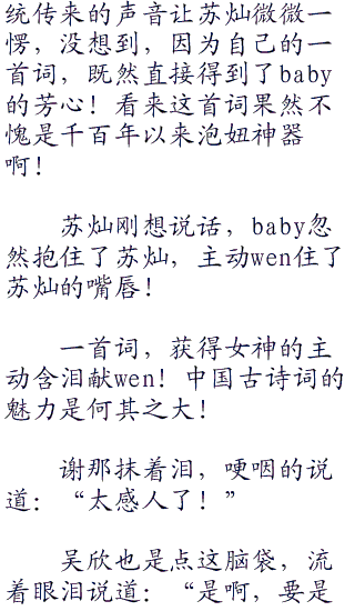 baby的眼神里尽是痴迷,她感觉自己的心都在苏灿念出这首词的瞬间完完全全的给了苏灿!
