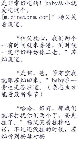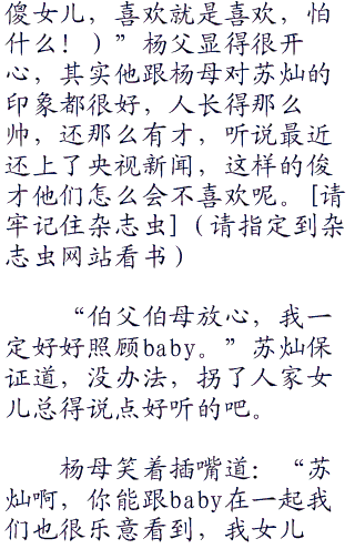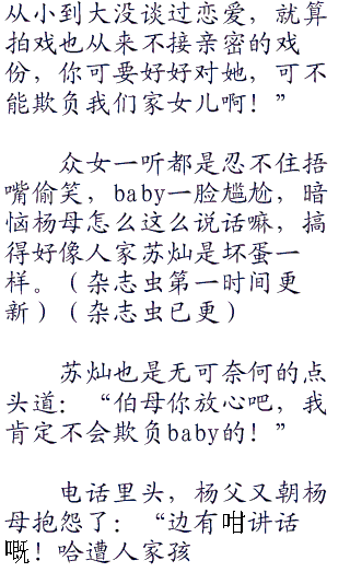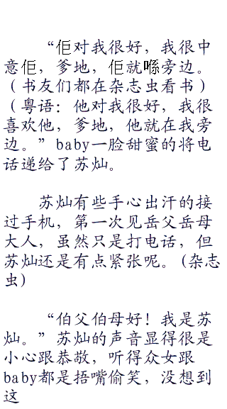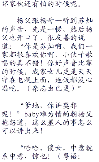 杨父说完接过电话,声音又是慈祥的对着baby说道:“阿女,苏灿人点样?对你好唔好?(粤语:女儿,苏灿人怎么样?对你好不好?)”