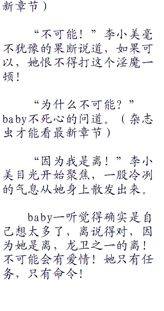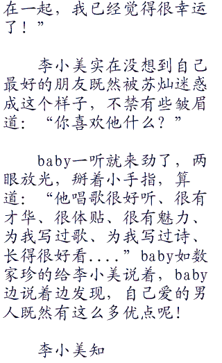 听到baby的询问,李小美没有回答baby的问题,而是朝baby问道:“你为什么会跟他在一起?”