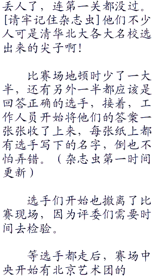 不单单是观众难倒一片,选手们也是被这第一个问题给弄得焦头烂额,就这一题,就将刷下一大片的选手,眼看时间一点一滴的流走,不会也没办法了,蒙呗,万一蒙对了呢。